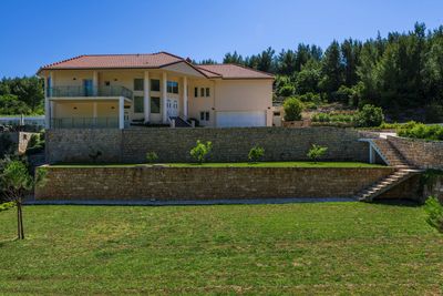 Villa is surrounded by 16 600 square meters of private property enriched with lawn, olive groves, beautiful garden with various flowers, and terrace in front with terrace furniture, covered gazebo with dining area next to the outdoor barbecue / grill, and large 100 square meters swimming pool with heating possibility surrounded with comfortable sun beds, sun umbrellas, and terrace sitting furniture.