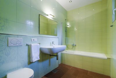 At the first floor are 6 bedrooms. 5 bedrooms are with double beds, and one bedroom is with 2 single / twin beds. 3 bedrooms have en-suite bathroom with Jacuzzi bathtub, while other 3 bedrooms have shared bathroom with bathtub. There is also one separated toilet room at this floor.