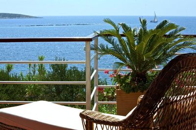 Wooden sundeck on the beach below the villa, sun umbrellas and beach sun beds for beach and terraces, private mooring for small boat in front of the villa, 2 bicycles, private parking for 2+ cars and additional parking available.