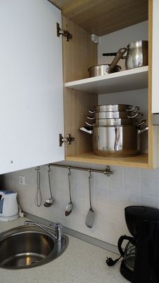 At the left side of the ground floor is a modernly furnished and fully equipped an open plan kitchen with oven, stove, microwave oven, fridge, freezer, dishwasher, coffee maker, dishes, and all cooking and eating utensils needed. Together with the kitchen is a dining area with table and chairs suitable for 6 guests. At the right side of entrance door is one bedroom with double bed and en-suite bathroom with shower.